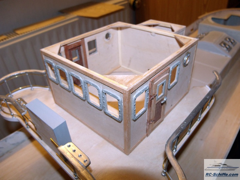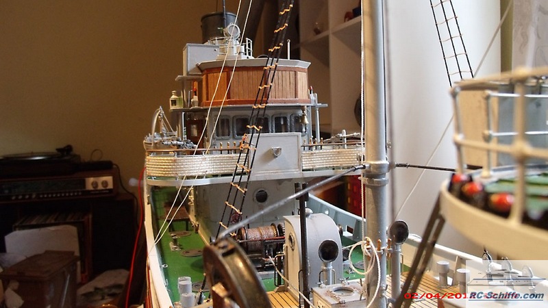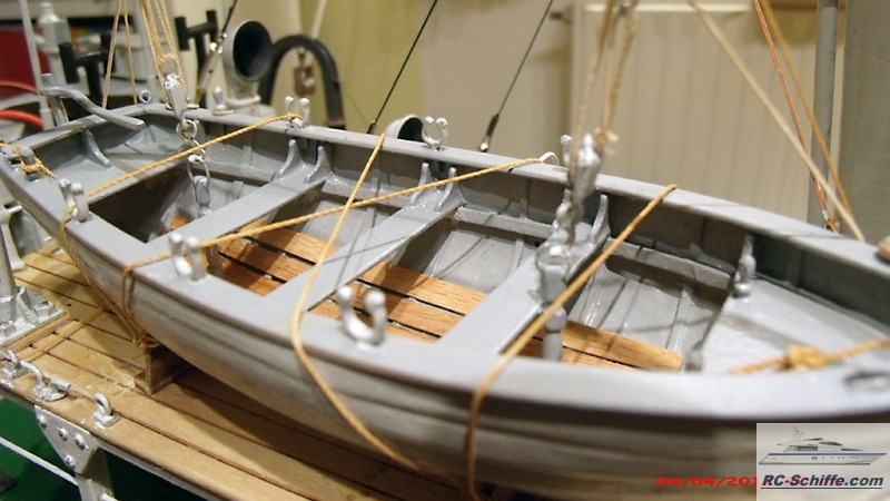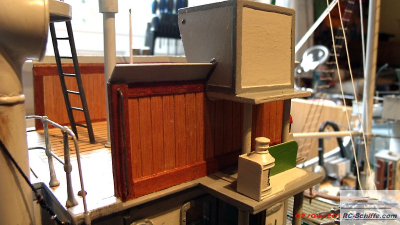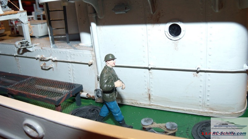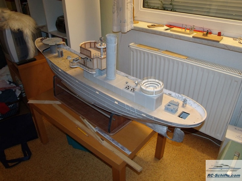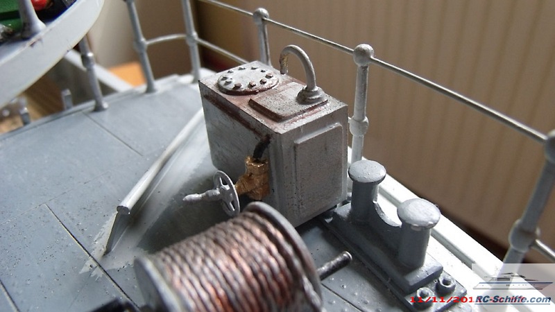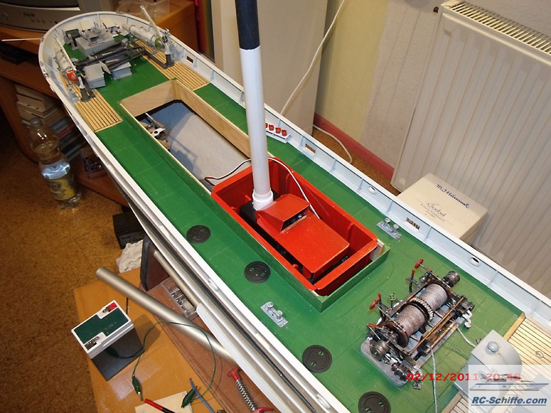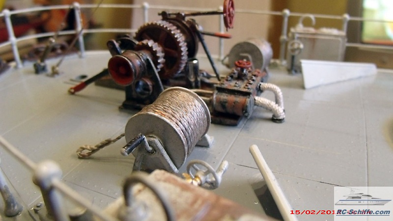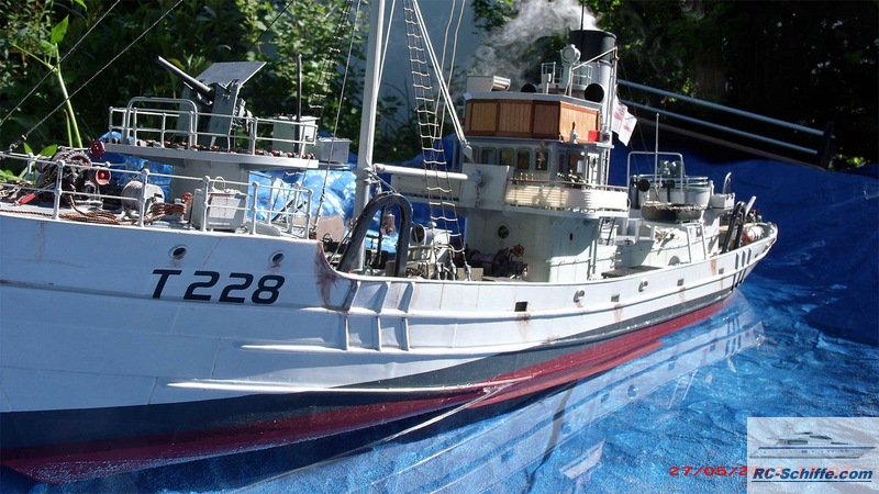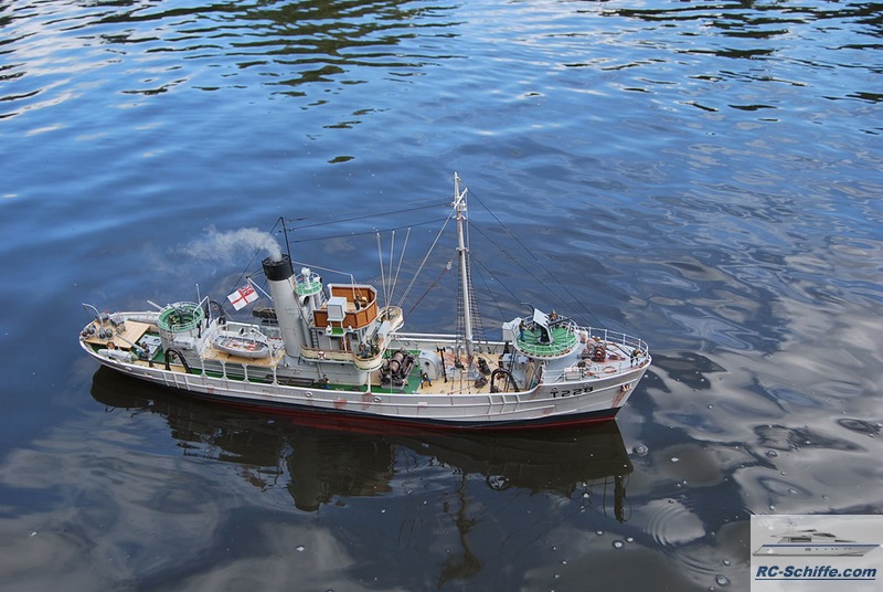 | Tipps für den Bau | Das Schiff der "Roundtable Clas" ist aus einem Englischen Baukasten entstanden "mountfleetmodels" Original 1942 in Dienst gestellt, nach WWII bis 1981 in der Hochseefischerrei. Der Rumpf und ein Teil des Deckshauses sowie der Schornstein ist aus GfK. Alle anderen Aufbauten, das Deck, und die Galgen sind aus Sperrholz 1 - 2mm und div. Leisten. Es sind weit mehr als 1350 Weismetall-Beschläge verbaut, der Schwerpunkt liegt daher sehr hoch, entsprechend ist es notwendig genügend Ballast tief im Rumpf zu verbauen. 7,5 Kg Batterien + 2,5 Kg Blei Gesamtgewicht ~20Kg Eine Transportkiste und ein "Bollerwagen" sorgen für einen sicheren Transport Mein Hochdachauto (Renault-Kangoo) macht es mir leicht. |