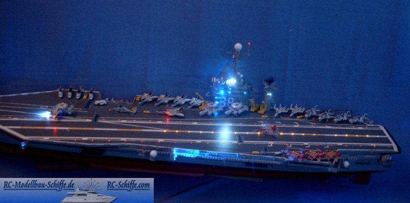 | Besonderheiten | Soundmodul mit verschiedenen Funktionen - Start Jet ( dabei leuchten die LED Triebwerke, Positionslampen sowie der Bugscheinwerfer des startenden Jets auf und Startgeräusche setzen ein ) - Hubschraubergeräusch ( dabei dreht sich der Rotor des auf dem Flugdeck stehenden Hubschraubers und die Positionslampen blinken ) - Start Propellermaschine Hawkeye: - Propellergeräusche startender Hawkeye, Positionslichter und Landescheinwerfer leuchten. - Landung Jet (Landegeräusche, Triebwerke mit LED;s bestückt , die Positionslampen sowie der Landescheinwerfer leuchten auf ) |