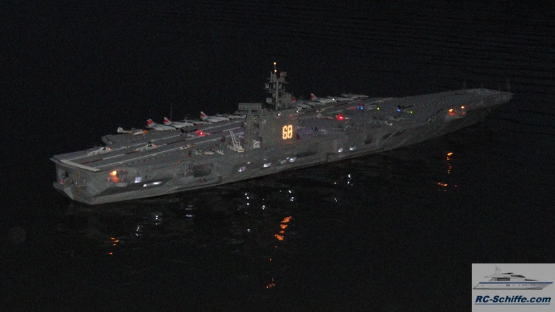 | Besonderheiten | 14 Antennen hoch und runterfahrbar, 6 Radar drehbar, 3 Raketenwerfer drehbar, Anker fallen lassen und reinholen, Hubschrauber Rotoren drehbar, Soundmodul, Jede Menge Licht: Komandoturm: 68 beleuchtet, Suchscheinwerfer, Arbeitsleuchten, 48 LED's, Navigationslicht (Lauflicht), Innenbeleuchtung, Toplicht, Radarturm: Suchscheinwerfer, Landedeck: Lauflicht, Startkanzel, Hubschrauberkanzel, 2 Flugzeuge mit Düsenbeleuchtung plus Positionslicht, 2 Autos mit Beleuchtung, Rumpf: Landekreuz (Meatball), Plattformen Raketenwerfer, Klüsen, Hangerbeleuchtung, Schweizlicht, Versorgunsplattform und Lüfterbleche beleuchtet, sämtliche andere Plattformen sind beleuchtet. |