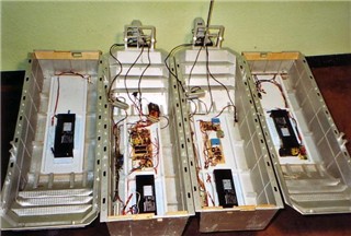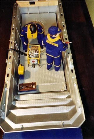| Besonderheiten | Liftbarer Aussenmotor Beleuchtung Wasserspritze restliche Elektronik selber gebaut Rumpf aus Holz ( GFK beschichtet ) Nach Fotos und selbstgefertigten Skizzen gebaut zwei bewegliche Auffahrrampen |